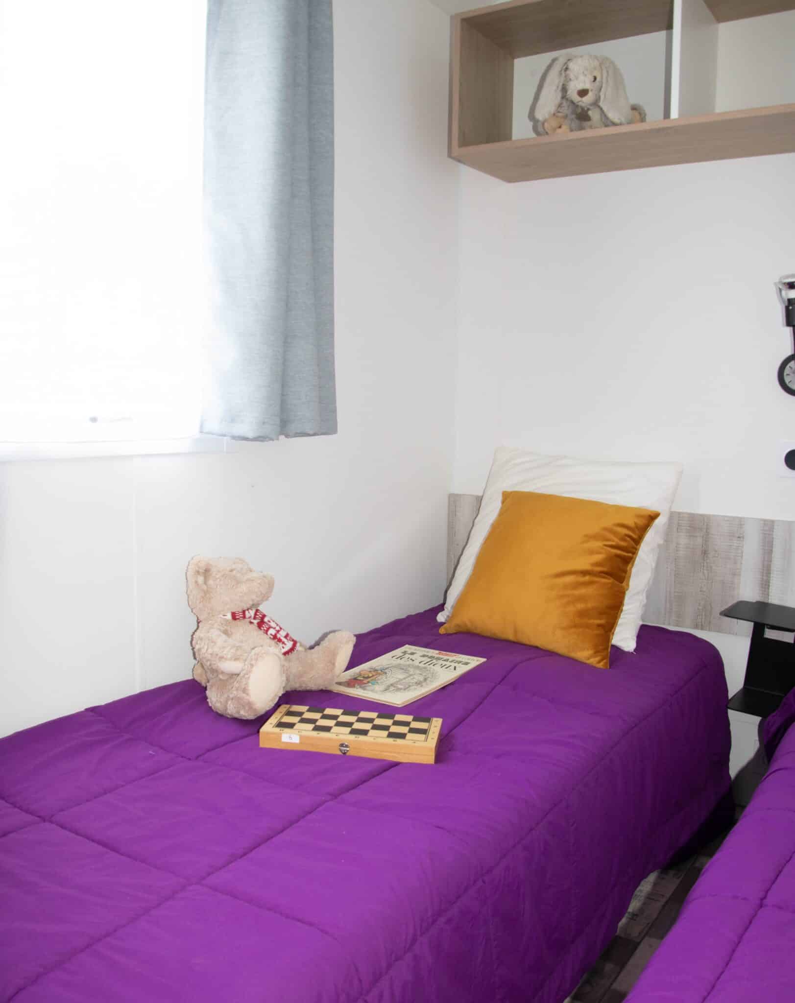 Le mobil-home est pratique si vous comptez venir en nombre. Il peut en effet accueillir six personnes. Il comporte par ailleurs un séjour-cuisine avec TV et divers matériel de cuisine. S’ajoutent à cela une salle de bains complète et des toilettes indépendantes, sans oublier le chauffage et la terrasse.