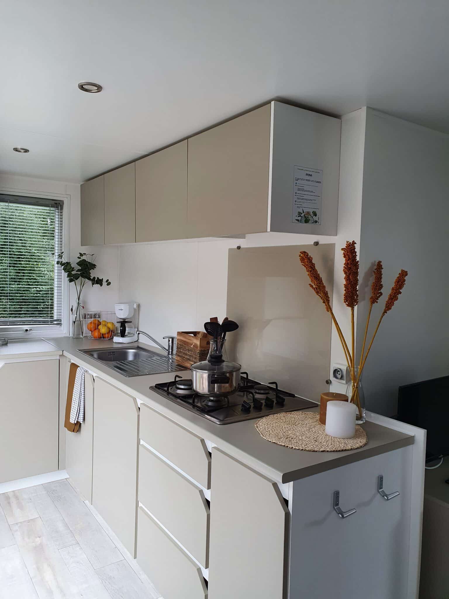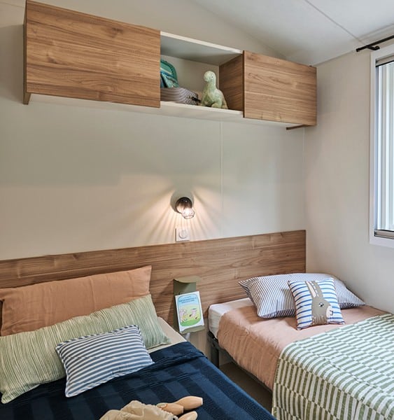 Le mobil-home est parfait pour un séjour en amoureux ; il y a aussi de l’espace pour accueillir un bébé.
